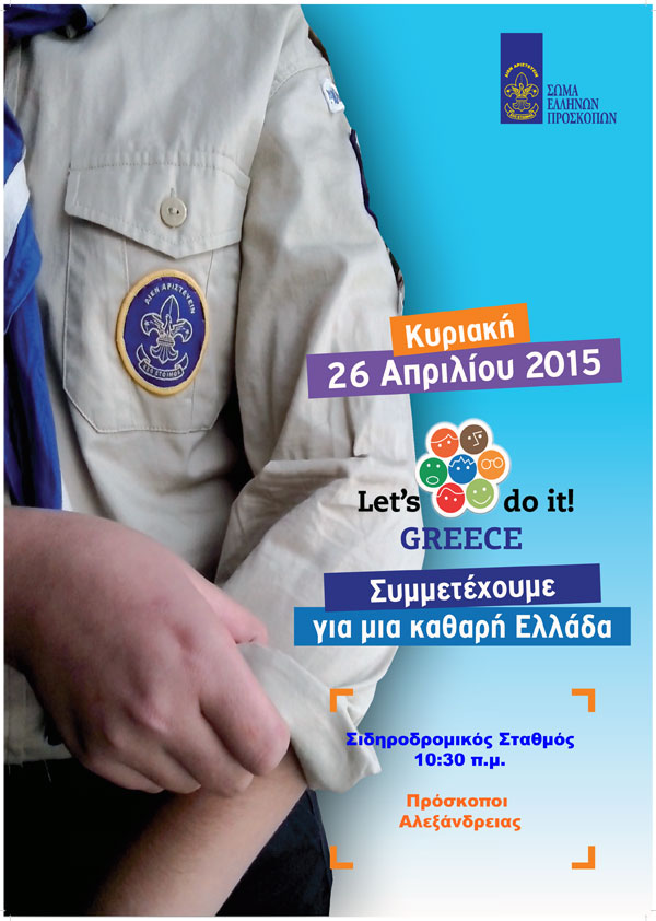 Με ιδιαίτερη χαρά σας ανακοινώνουμε ότι οι Πρόσκοποι Αλεξάνδρειας, στο πλαίσιο της προσπάθειας για ενεργό κοινωνική προσφορά και δράση, θα συμμετέχουν την Κυριακή 26 Απριλίου 2015, στη δράση “Let’s Do It Greece”, τη μεγαλύτερη και ταχύτερη αναπτυσσόμενη εθελοντική καμπάνια διεθνώς, η οποία έχει πραγματοποιηθεί ήδη τέσσερις φορές στη χώρα μας. Η συγκεκριμένη εθελοντική εκστρατεία έχει υιοθετηθεί από χιλιάδες πολίτες και εκατοντάδες εθελοντικές ομάδες, περιβαλλοντικές οργανώσεις, σχολεία και φορείς σε όλη την Ελλάδα. Σκοπός μας μέσα σε μία ημέρα, να συντονιστούμε ταυτόχρονα σε ολόκληρη την Ελλάδα, πραγματοποιώντας εθελοντικές δράσεις καθαρισμού, εξωραϊσμού και αισθητικής αναβάθμισης σε κάθε γωνιά της χώρας.