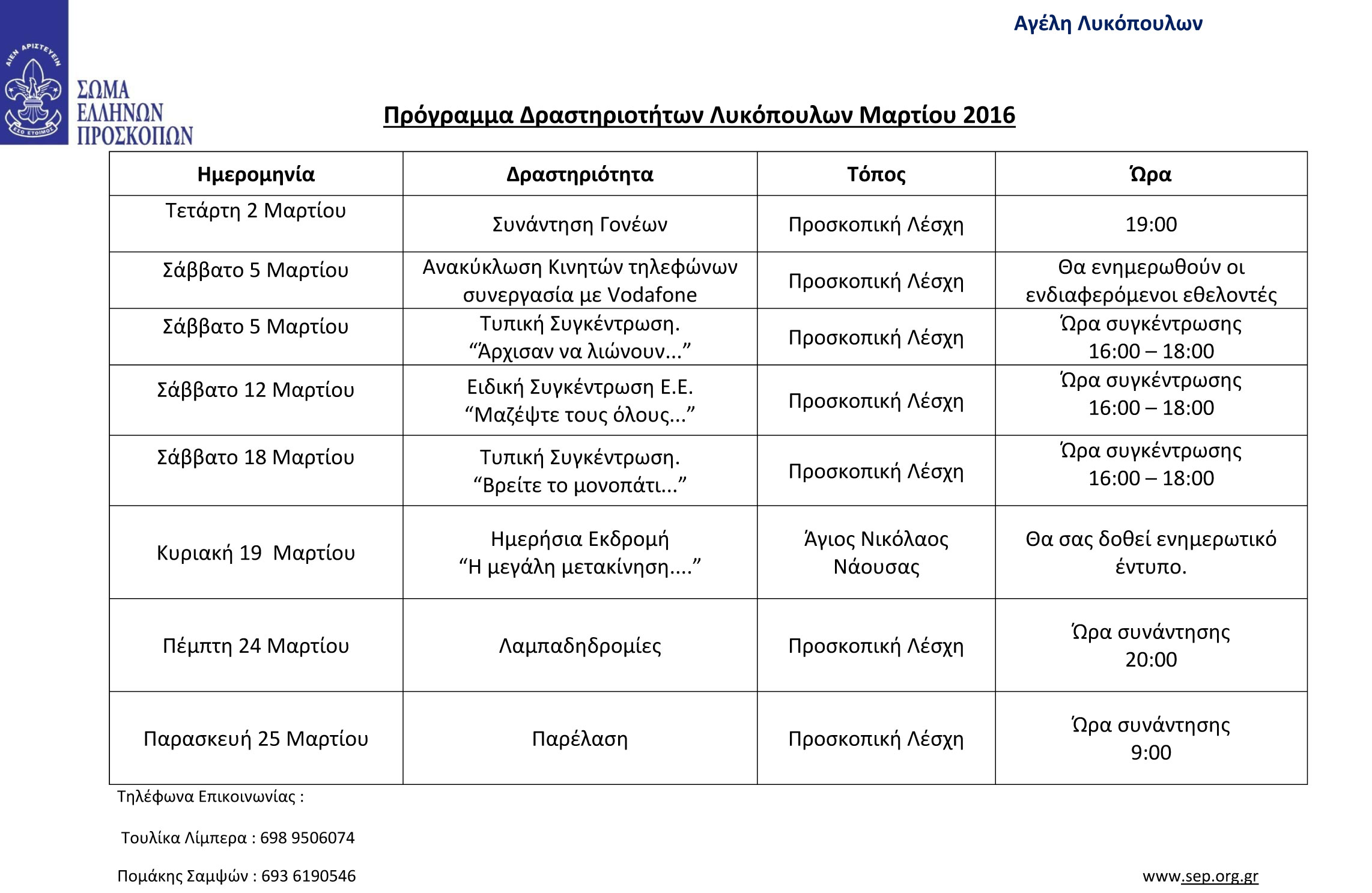 Πρόγραμμα Δραστηριοτήτων Λυκόπουλων Αλεξάνδρειας, Μάρτιος 2016 2 Μαρτίου 2016 by Πρόσκοποι Αλεξάνδρειας , Πρόσκοποι Ημαθίας No Comment Πρόγραμμα Δραστηριοτήτων Λυκόπουλων Αλεξάνδρειας Μαρτίου 2016 Δείτε το κι εδώ. You may also like 03Νοέ20200 Ανακοίνωση Νο87 : Αποτελέσματα Εκδρομής Εξερεύνησης Δάφνης . 06Ιαν20200 2η ομάδα Αεροπροσκόπων Βέροιας & 5η ομάδα Προσκόπων Βέροιας στις γειτονιές της Φυτειάς Ημαθίας 05Ιαν20200 Προσκοπική Ομάδα Διάσωσης Άγριας Ζωής , 3ου Συστήματος Προσκόπων Βέροιας No Comment You can post first response comment. Leave A Comment Πατήστε εδώ για να ακυρώσετε το σχόλιο. Name (required) Email (required) Website Comment... Please enter your name. Please enter an valid email address. Please enter a message. Post Comment Sign me up for the newsletter! PreviousΑΝΑΚΟΙΝΩΣΗ Νο 34 : Διαδικασία Ανάδειξης Α.Σ. 2ου Σ.Α/Π. Έδεσσας NextΑνακύκλωση κινητών & αξεσουάρ, Πρόσκοποι Αλεξάνδρειας